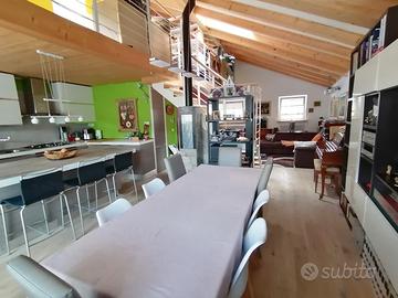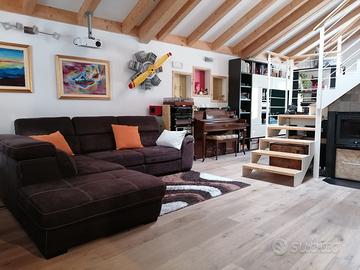 al primo piano si trova un'ampio terrazzo dal quale si accede alla zona giorno open space con salotto, sala pranzo, cucina abitabile, bagno e poggiolo;