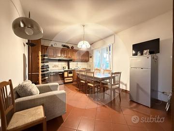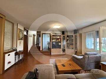 L'appartamento al piano terra presenta un accogliente soggiorno con angolo cottura, due camere matrimoniali spaziose, un bagno ben arredato e una lavanderia funzionale. Inoltre, include un ampio studio perfetto per il lavoro da casa o come sala giochi per i bambini e una cantina utile per riporre oggetti.