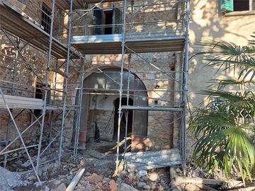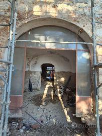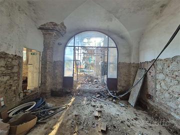 Il soggiorno è caratterizzato da un ampio portale vetrato ad arco e soffitto con volta a crociera completamente recuperato; oltre la sala troviamo una splendida cucina abitabile di 33 mq con voltine a mattoni faccia vista e l'accesso al giardino tergale.