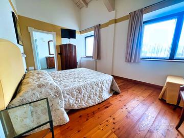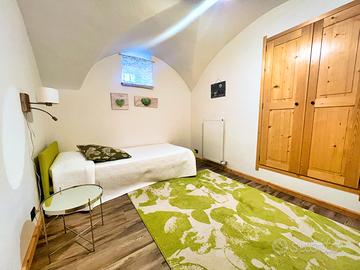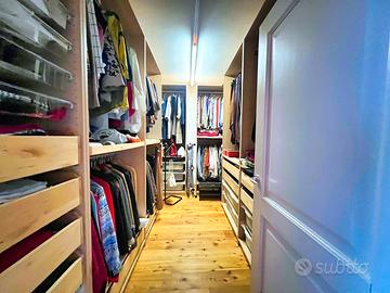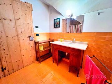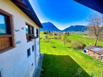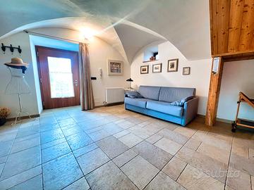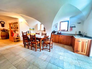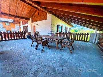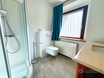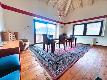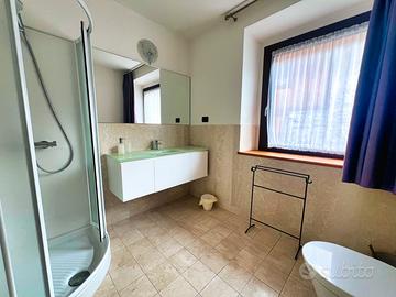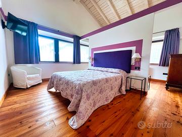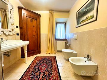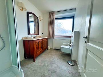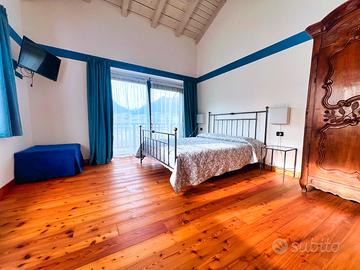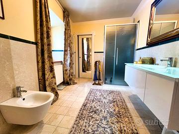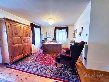 La composizione dell'immobile è la seguente: a piano terra troviamo una spaziosa taverna con cucina e accesso diretto al giardino, una camera da letto, un bagno finestrato e una grande cantina. A primo piano è presente un'elegante appartamento realizzato con materiali di pregio così composto: zona giorno con cucina a vista, balcone panoramico con vista sulle montagne circostanti, camera matrimoniale con cabina armadio e bagno privato, seconda camera matrimoniale, secondo bagno e un'elegante corridoio che conduce a uno spazio aperto, attualmente adibito a studio ma facilmente convertibile in ulteriore soggiorno, libreria o camera. Al secondo piano è presente un secondo appartamento composto da zona giorno con cucina, tre camere matrimoniali, ognuna con bagno privato, un corridoio e un ampio balcone accessibile dalla zona giorno. Inoltre, a questo piano si trova una grande terrazza coperta.