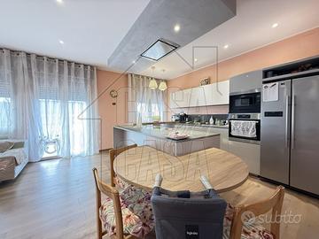 Salendo al primo piano troviamo un accogliente terrazza di oltre 30mq dove godersi pranzi o serate all'aperto affacciati sul giardino circostante, al superiore piano troviamo il luminosissimo open space: la zona giorno è caratterizzata da grandi vetrate con tende leggere che donano ariosità agli ambienti, cucina moderna ad isola completa dei migliori elettrodomestici (forno alto, frigorifero americano), comoda area pranzo collegata direttamente