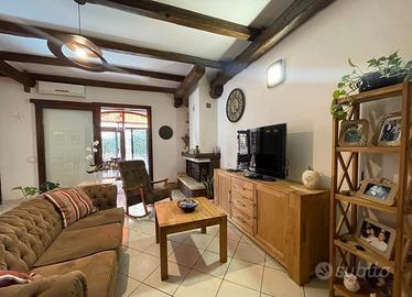 Al piano terra l'ingresso conduce a un accogliente soggiorno, caratterizzato da grandi finestre in legno che garantiscono un'eccellente illuminazione naturale e si affacciano sul giardino privato.