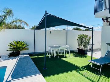 Un elegante cancello automatico introduce a un ampio patio pavimentato, perfetto per accogliere più veicoli in totale comodità. L'area esterna, pensata per vivere appieno ogni momento della giornata, si distingue per la splendida piscina scenografica incorniciata da prato sintetico e da un generoso solarium, dove godere del sole in assoluta privacy. Un gazebo attrezzato crea l'ambiente ideale per pranzi e cene all'aperto, in un'atmosfera intima e rilassata.