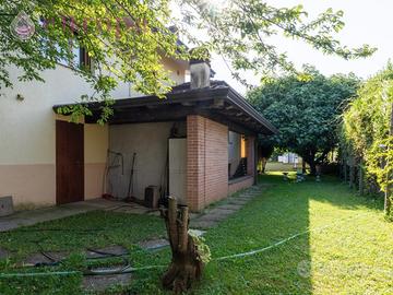 All'esterno, un portico travato a vista con caminetto a legna regala ulteriore valore all'abitazione, affacciandosi su un giardino piantumato di 730mq, perfetto per chi desidera vivere anche l'esterno in pieno comfort.
