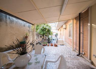 Si accede al cortile frontale dalla via Palermo attraverso cancello pedonale e altro cancello carrabile. Al piano strada troviamo un ampio ambiente di circa 70 mq una volta adibito a garage e oggi convertito in uso ufficio con accessi indipendenti.