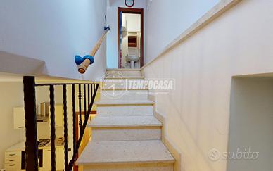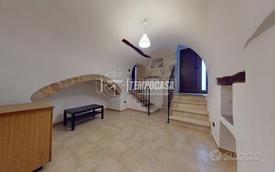 il secondo ingresso si apre sul vano scala principale, collegato internamente alla tavernetta e che conduce al piano rialzato in cui si accede ad una accogliente zona giorno con angolo cottura, caratterizzata da pietra a vista, volte a botte e nicchie originali che raccontano la storia dell'abitazione.