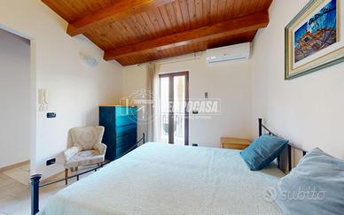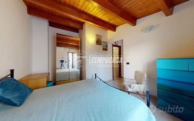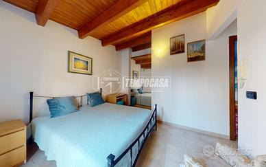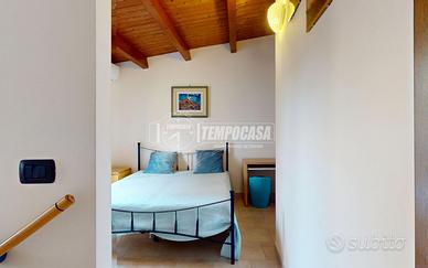 Il secondo livello ospita una camera da letto matrimoniale dal fascino unico, impreziosita da un soffitto mansardato con travi in legno a vista.