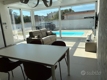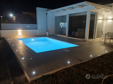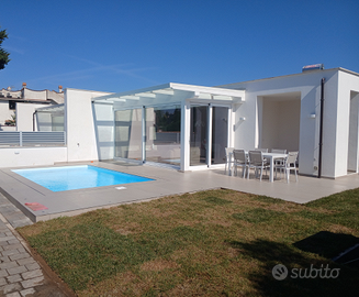 Terracina, Porto Badino, zona tranquilla e ben servita, a 250 metri dal mare affittasi esclusiva villa di nuova costruzione, dal design unico e moderno, dotata di tutti i confort, così composta: ingresso, doppio salone veranda e cucina a vista, due camere, doppi servizi, portico, patio attrezzato con giardino e piscina privata.