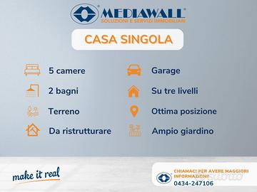 (Riferimento: BR-278-RV) Maniago (Rif. BR-278-RV). CASA SINGOLA EVENTUALMENTE DIVISIBILE | AMPIO GIARDINO | In ottima posizione ben servita a pochi minuti dalla piazza principale, casa completamente indipendente degli anni '60, da ristrutturare, disposta su tre livelli. La casa è composta da deposito, garage e terreno di proprietà di circa 300mq. E' così disposta: piano TERRA: ingresso, ampia zona pranzo con cucina abitabile, soggiorno, bagno, ripostiglio sottoscala; al piano PRIMO: due ampie camere matrimoniali, un ripostiglio che può essere trasformato in comoda cabina armadio o studio, bagno; al piano SECONDO, due ampie camere matrimoniali, studio, ripostiglio; al piano TERZO: ampia soffitta. In corpo staccato dalla casa, ampio deposito, garage e terreno. Occasione da non lasciarsi scappare. Possibile divisione in due comode unità abitative.