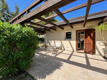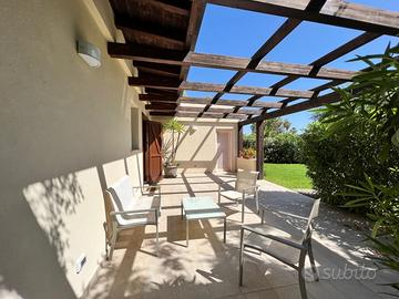 (Riferimento: 41) Pula All'interno del riservato e elegante condominio Is Molas Golf, disponiamo di un ampia e rifinita villa. La proprietà si sviluppa su un unico livello piano terra ed è composta ingresso, ampio e luminosissimo salone, cucina, camera da letto matrimoniale con bagno privato, camera padronale con bagno e cabina armadio, terza camera con bagno privato, disimpegno, studio, bagno padronale e locale lavanderia. Rifiniture di primissimo livello, un piccolo giardino privato con loggiato e un posto auto ad uso esclusivo completano questa interessante soluzione.