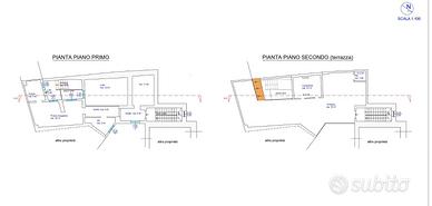 Mediante scala interna si accede al piano primo e composto da un'ingresso, due camere da letto, cucina, sala da pranzo e bagno e al piano secondo troviamo una bellissima terrazza panoramica di 80 mq. con due locali ad uso deposito.