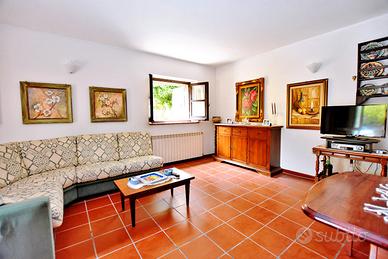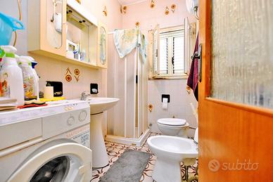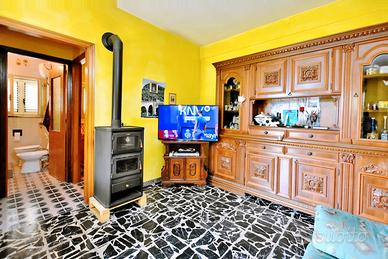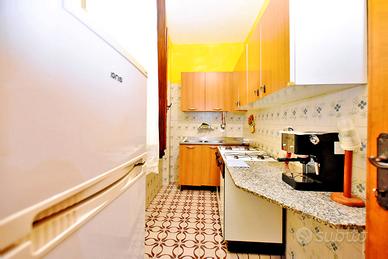 Accesso tramite l'ampio cortile con terrazza. Ingresso luminoso, bagno e cucina sulla destra, grande soggiorno con balcone panoramico sulla sinistra. La zona notte è separata da una porta a vetri e comprende camera matrimoniale con balcone, secondo bagno e una stanza con caminetto (ex cucina), oggi ideale come camera bimbi o studio, con accesso diretto al cortile.