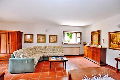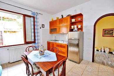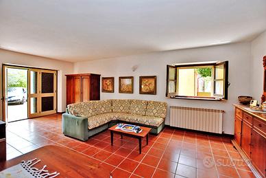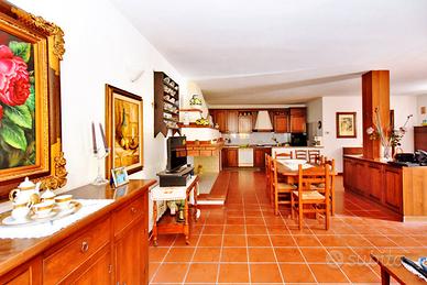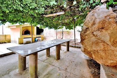 Dal cortile si accede a una grande sala con cucina, bagno e caminetto, perfetta come taverna per feste e pranzi. All'esterno, pergola con forno e barbecue, tavolo per mangiare all'aperto, terreno retrostante con bombolone del gas e antico pollaio.