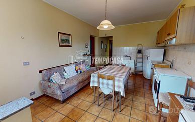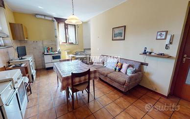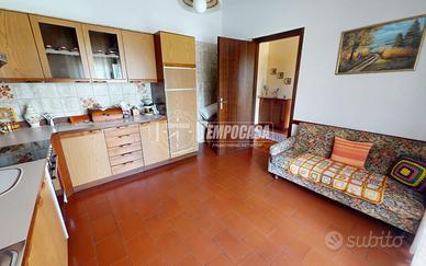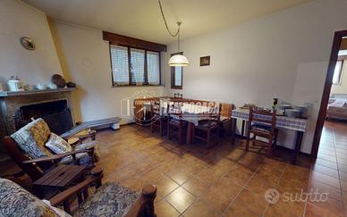 La parte abitativa risulta al primo piano ed è composta da ampio corridoio d'ingresso, che divide gli accessi alla cucina abitabile, e all'ampio soggiorno dotato di camino a legna. Entrambi gli ambienti sono dotati di uscita tramite porta finestra, all'ampio balcone, che funge anche come ingresso alla soluzione.