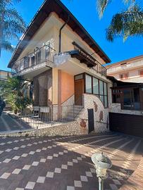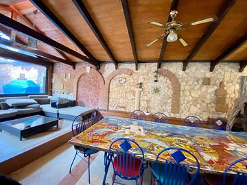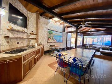 L'accesso principale è posto al piano rialzato , costituito da : spazioso soggiorno con termocamino, collegato a destra da un vano scala che porta alla zona notte. Proseguendo frontalmente a sinistra troviamo un ampio servizio igienico mentre sulla destra troviamo un vano scala collegato al piano seminterrato. A sinistra dell'ampio soggiorno troviamo una porta a scrigno che separa il salone da un ampia cucina a vista e sulla sinistra un ampio vano lavanderia/ ripostiglio ed proseguendo a destra troveremo un ampio spazio con una seconda cucina con affaccio sul portico panoramico esterno verandato chiuso .