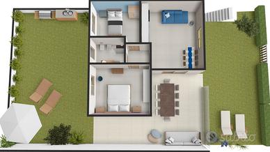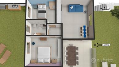 Internamente troviamo un'ampia zona giorno, un comodo bagno, due camere da letto spaziose e luminose.