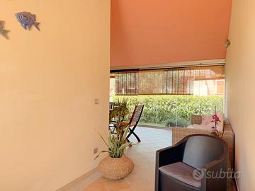 Superato il fresco giardino ci accoglie una luminosa veranda con vetrata composta da vari pannelli in vetro pieghevoli posizionati lungo un binario che permette di aprirsi completamente;
