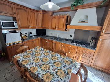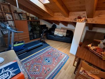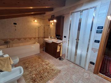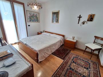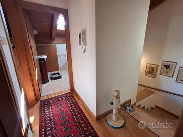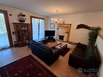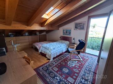 Proponiamo in vendita ampia porzione laterale di villa composta al piano terra da portico, soggiorno con stube, sala pranzo, cucina abitabile, bagno, camera matrimoniale con guardaroba, studio, ripostiglio. garage e circa 500 mq. di giardino; al piano primo da ampia mansarda travata a vista con tre camere matrimoniali, bagno, poggioli e ripostiglio. Ottime finiture. Bella zona residenziale tranquilla. Classe energetica C. Rif. MX1006