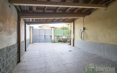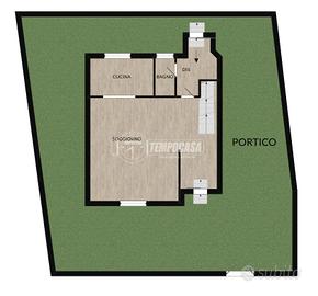 L'ingresso si apre su un affascinante portico coperto con tetto in legno, perfetto come posto auto o zona conviviale.