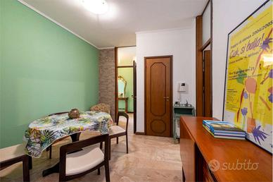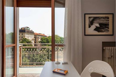 In palazzo degli anni '70 con doppio ascensore e servizio di portineria proponiamo, al quarto piano, stanza doppia di 35 mq, completamente arredata con: 2 letti singoli di 90 x 200, 2 scrivanie, 2 sedie, 2 armadi, 2 librerie, un divanetto, un tavolo tondo con 2 sedie e due balconi.