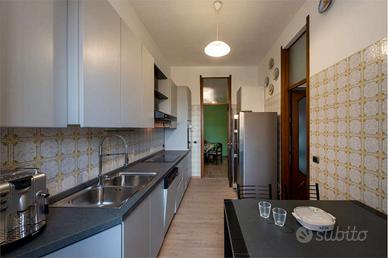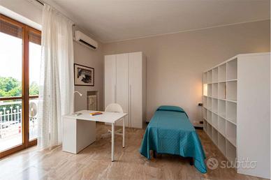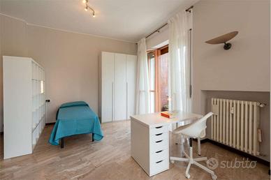 La camera si trova all'interno di un appartamento di circa 190 mq composto da 5 stanze, ciascuna con un inquilino. In comune abbiamo soggiorno, cucina abitabile e tre bagni e tre balconi. Ripostiglio.