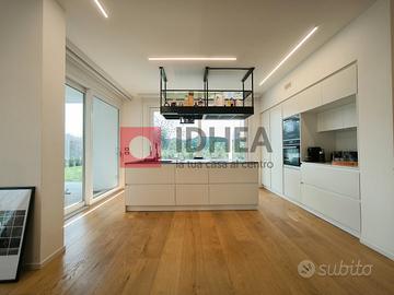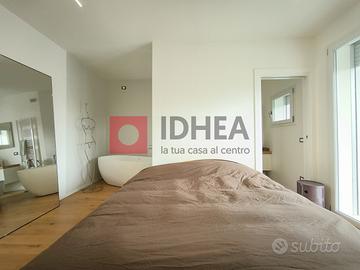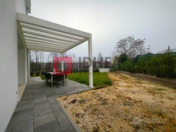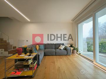 Tra le dotazioni: riscaldamento/raffrescamento radiante a pavimento, impianto fotovoltaico da 6 kW con batteria d'accumulo per massima efficienza energetica, ventilazione meccanica controllata VMC, cappotto esterno termoisolante e raffinati listoni parquet oversize in tutte le stanze. Gli ambienti risultano ariosi grazie alle linee essenziali dell'arredo contemporaneo; le ampie superfici vetrate garantiscono privacy ma anche continuità visiva col verde circostante del giardino dove rilassarsi o far giocare i bambini in sicurezza.