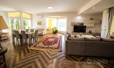 Al piano terra dall'ingresso con ascensore si accede ad un'ampia zona living luminosa con parquet in legno, grandi vetrate con accesso alle terrazze esterne coperte e vista sulla piscina. Al piano terra una sala pranzo, cucina e un bagno.