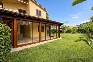 La villetta dispone di un porticato in legno chiuso con veranda ermetica abitabile e 2 posti auto riservati all'interno del residence adiacenti la villetta;