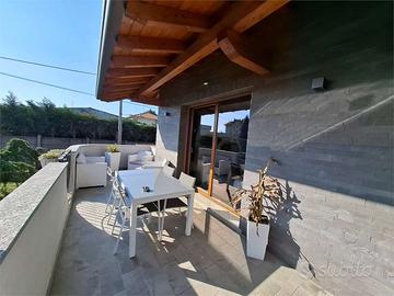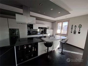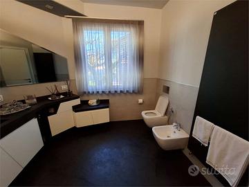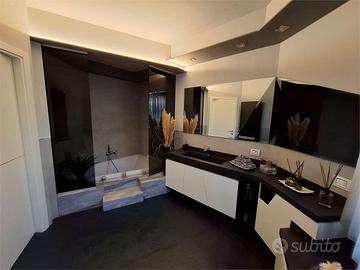 Il piano abitativo principale è il piano rialzato, dove troviamo il soggiorno molto grande, con vetrate sull' ampio terrazzo, cucina abitabile con bellissima penisola, dal soggiorno si accede al bagno di servizio, con ampia vasca doccia, tramite pochi gradini si accede alla zona notte, dove troviamo una camera matrimoniale con angolo palestra, il bagno, doppia cabina armadio, e una doccia/sauna tutta in mosaico, oltre ad una ulteriore camera, ideale anche come studio.