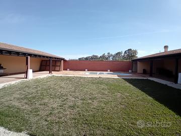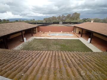 Oristano frazione Massama- Splendida villa con piscina circondata da spazio verande attrezzato per il relax nel grande giardino. La villa distribuita su 2 livelli al suo interno si compone di: sala-soggiorno, cucina abitabile, 2 bagni, 2 camere letto e una cabina armadio. Terrazza. Adiacente alla villa troviamo un capannone di 200 mq con installazione di impianto fotovoltaico di 30 KW per l'autoconsumo e lo scambio in rete. Nel giardino portici e verande per 350 mq ca che circondano la piscina. Campetto erboso e 3000 mq di terreno. La proprietà è ottimamente collegato alla città di Oristano e alla strada statale 131. Il tutto protetto da recinzione. Stato: ottimo, pronto da abitare.