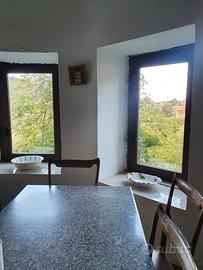 il primo piano da enorme salone con camino, 2 grandi camere, cucina, bagno, terrazzo e balconcino;