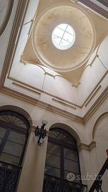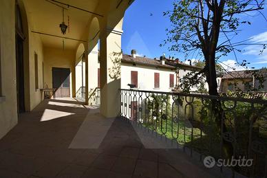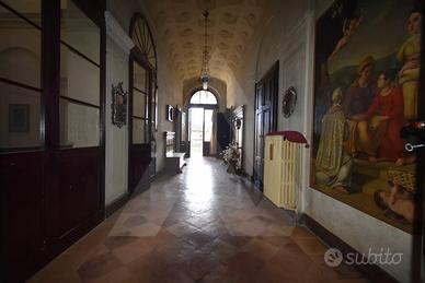 INTERNO: L'ingresso indipendente dal portico esterno permette l'accesso ad un ampio androne, il quale mette in comunicazione la struttura con il cortile interno tramite pregevole scalinata. Da questa si sale al piano primo dotato di tre camere matrimoniali di amplissime metrature, un grande vano giorno, uno studio, un tinello, un ampio loggiato che affaccia sul cortile, una cucina abitabile e un bagno finestrato. Un ulteriore vano scala, posto internamente alla struttura, separa gli appartamenti "padronali" da quelli di servizio e conduce ad un sottotetto di generosissime metrature. Al piano terra si trova un locale adibito a deposito. Completano la soluzione una cantina di proprietà, posta nel piano interrato, alla quale si accede dal cortile, e due locali (ufficio e negozio) il cui ingresso è garantito solo dall'esterno, sotto il portico.