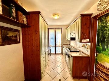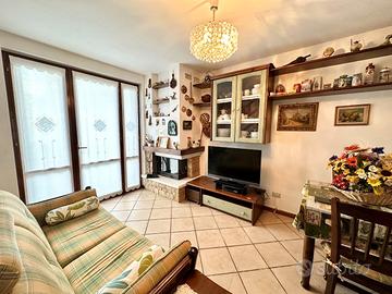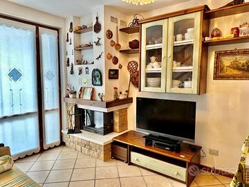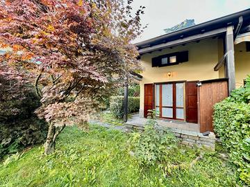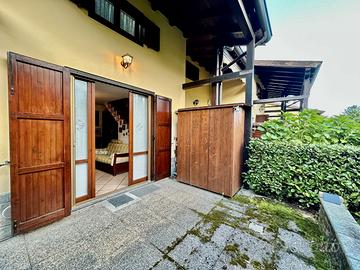 Ingresso su ampio soggiorno con camino, perfetto per le serate in famiglia, e cucina a vista che si affaccia direttamente anch'essa sul giardino. Dal lato cucina si accede a una zona esterna attrezzabile per mangiare all'aperto, ideale per grigliate e momenti di relax. Completa il piano un bagno finestrato.