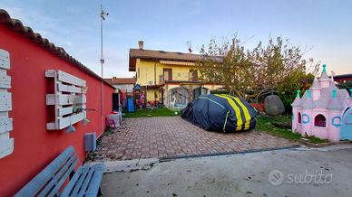 Il cortile esterno si presenta per metà pavimentato, perfetto per il parcheggio delle auto, e per metà piantumato. Sul retro dell'abitazione è inoltre presente un prefabbricato funzionale, attualmente adibito a cantina.