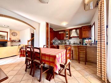 L'abitazione presenta l'ingresso sull'ampio soggiorno che conduce a una cucina abitabile con sfogo sul portico, al bagno finestrato con doccia, alla comoda lavanderia, al ripostiglio ed al locale accessorio utilizzabile come autorimessa o magazzino.