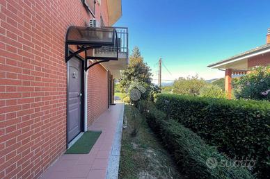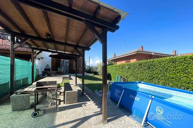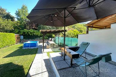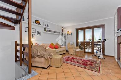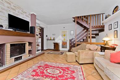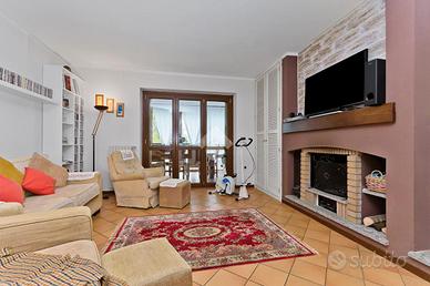La casa si sviluppa su quattro livelli. Al piano terra si trovano la cucina abitabile, un bagno di servizio e un ampio soggiorno con camino e con accesso diretto a una veranda coperta. Al primo piano sono presenti due camere da letto, di cui una con cabina armadio ed entrambe con affaccio su un balcone, oltre a un bagno finestrato.