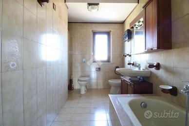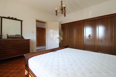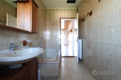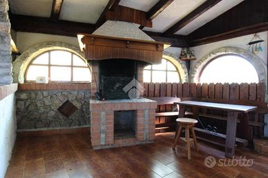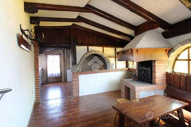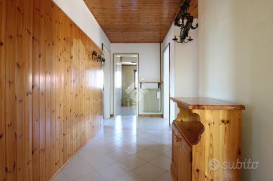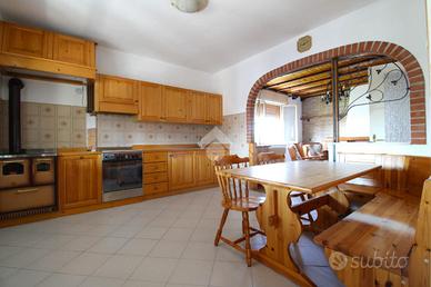 L'ingresso principale si apre con un corridoio che collega la cucina abitabile, il soggiorno dotato di caminetto a legna, il bagno finestrato completo di vasca e box doccia e due camere matrimoniali.
