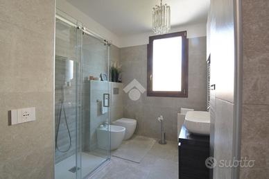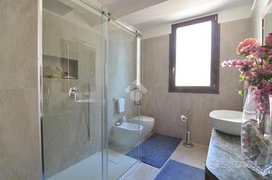 La proprietà si completa di un'autorimessa e di un'area esterna privata di circa 350mq, in parte adibita a giardino e in parte piastrellata dove sono presenti anche una fontanella e un barbecue in muratura.