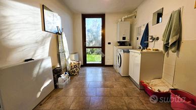 Entrando tramite l'ampio portico accediamo alla zona giorno composta da un ampio soggiorno con cucina abitabile, tramite un disimpegno abbiamo il bagno con doccia, la zona lavanderia con caldaia a condensazione dotata di accesso diretto interno al garage doppio.