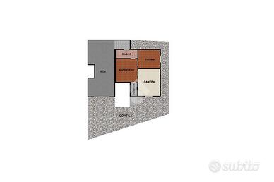 La soluzione è suddivisa in due locali ed è formata da: ampia cucina abitabile, camera matrimoniale ed il bagno con doccia, completa il piano abitato un locale cieco.