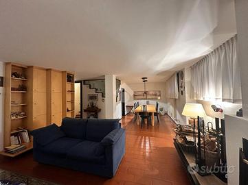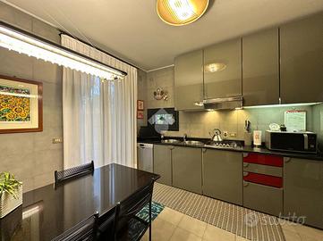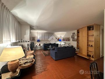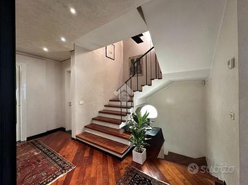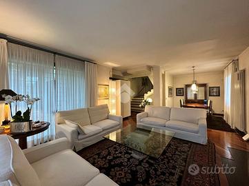 Porzione con scoperto privato di circa 400mq. Dal vialetto che attraversa il giardino raggiungiamo l'ingresso, che fa da disimpegno tra il soggiorno di circa 60mq, molto luminoso grazie alle ampie vetrate esposte a sud ed est, completamente pavimentato in legno e la cucina abitabile. Anche la cucina gode di molta luce data la portafinestra che da sul giardino.