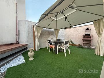 Al piano terra troviamo una luminosa zona giorno con cucina-soggiorno e un bagno con doccia finestrato, oltre a comodi spazi esterni ideali per pranzi all'aperto o momenti di relax.