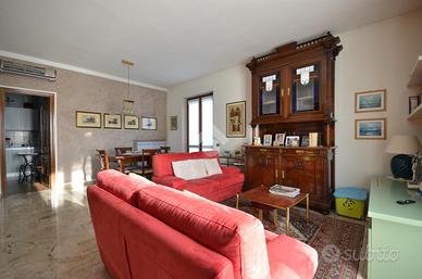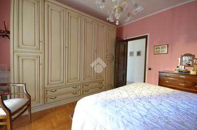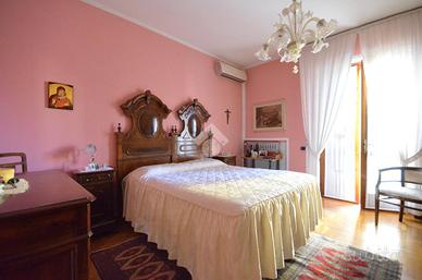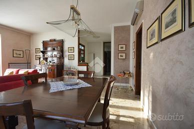 L'unità al piano terra si compone di ingresso, soggiorno con sala da pranzo, cucina separata e disimpegno che conduce alla zona notte, composta da due camere da letto matrimoniali, di cui una con balcone, e bagno finestrato. L'appartamento è dotato di riscaldamento a radiatori e impianto di climatizzazione. La costruzione risale al 1981, ma la soluzione risulta ben rifinita con pavimenti in marmo.