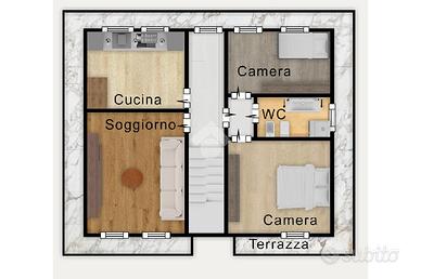 Al piano terra, l'immobile accoglie una stanza oltre un bagno di servizio e il piano primo ospita l'abitazione principale, composta da un luminoso soggiorno con sfogo esterno sul terrazzo che circonda l'intera struttura, una cucina abitabile, un bagno finestrato con vasca e due camere da letto. Nel piano seminterrato è presente un locale cantina/magazzino e l'ultimo piano vanta di un comodo solaio.