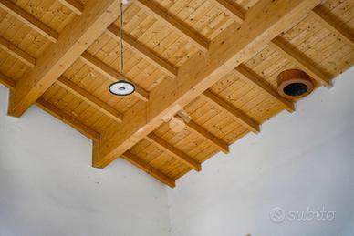 La copertura, con travatura a vista, conferisce un'atmosfera calda ed accogliente.