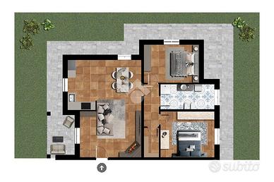 Tutto si sviluppa su un unico piano: un soggiorno ampio con camino, dove la luce entra da sud e disegna linee sul pavimento. Una cucina raccolta, due camere matrimoniali proporzionate, un bagno rinnovato con doccia e finestra, un ripostiglio e un portico che introduce al giardino.