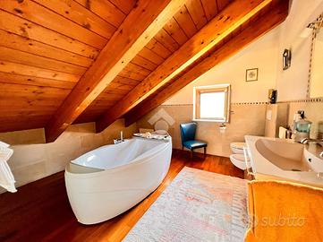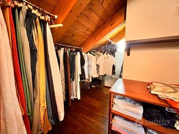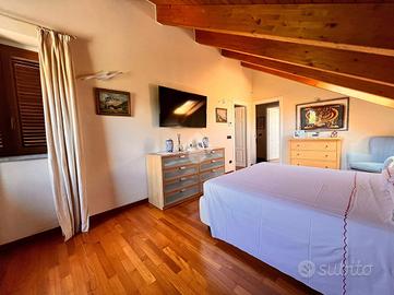 La zona notte si sviluppa al piano mansardato, ed è composta da due camere matrimoniali, entrambe con bagno privato, e una cabina armadio centrale posta tra le due stanze, pensata per organizzare al meglio lo spazio. Un dettaglio utile e discreto è la presenza di un pratico spazio a scomparsa, ideale per riporre valigie o oggetti di uso meno frequente.