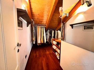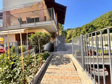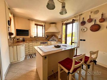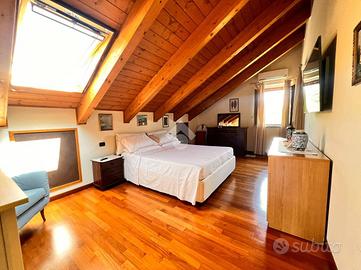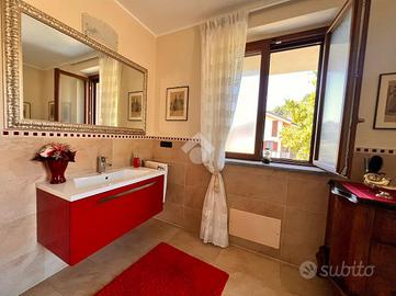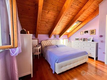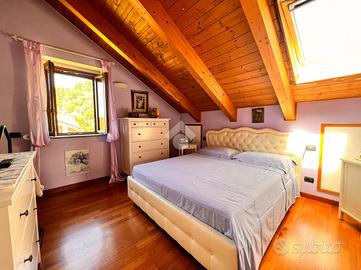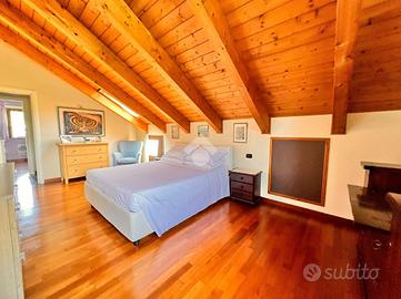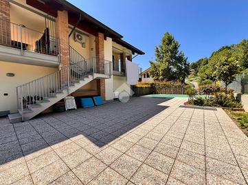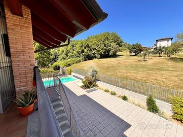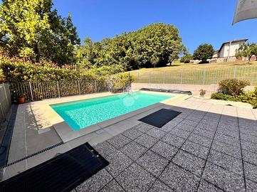 In un contesto residenziale riservato e tranquillo ai piedi della collina, porzione di villa bifamiliare disposta su due livelli, oltre a un piano seminterrato, dotata di ingresso indipendente, ampio cortile privato, terrazza e piscina. L'abitazione si sviluppa al primo piano, dove si apre una zona giorno spaziosa e luminosa, con un soggiorno accogliente e una cucina abitabile, entrambi affacciati su un grande terrazzo che si estende su tre lati della casa. Questo spazio esterno rappresenta un vero prolungamento dell'ambiente interno, ideale per pranzi all'apertoe momenti di relax. Sullo stesso livello si trova un bagno finestrato con box doccia, anch'esso con accesso diretto alla terrazza. La zona notte si sviluppa al piano mansardato, ed è composta da due camere matrimoniali, entrambe con bagno privato, e una cabina armadio centrale posta tra le due stanze, pensata per organizzare al meglio lo spazio. Un dettaglio utile e discreto è la presenza di un pratico spazio a scomparsa, ideale per riporre valigie o oggetti di uso meno frequente. Al piano seminterrato, collegato direttamente agli altri livelli tramite una scala interna in muratura, si trovano una funzionale lavanderia, una taverna versatile e l'accesso diretto al box auto doppio. Un ulteriore valore aggiunto è l'ascensore privato, che collega il garage direttamente alla zona giorno, garantendo massimo comfort. La proprietà, edificata nel 2010, è dotata di tutti i principali accorgimenti tecnologici: riscaldamento a pavimento alimentato a metano, caldaia a condensazione, pannelli solari per la produzione di acqua calda sanitaria, infissi in legno con vetrocamera, persiane, zanzariere, climatizzazione, impianto d'allarme volumetrico e perimetrale, videocitofono, telecamere di sorveglianza BTC, tende da sole estive, cancello elettrico, basculante automatizzata e porta blindata. Il cortile, di circa 150 mq, ospita una piscina metri 9x4. Questa abitazione rappresenta una soluzione ideale per chi è alla rice