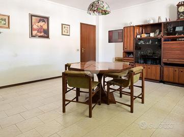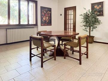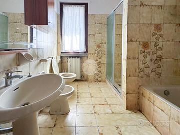 Proponiamo in vendita porzione bifamiliare degli anni '80 con giardino su tre lati. Varcato il cancellino si accede tramite una scalinata all'ingresso, dove veniamo accolti da un disimpegno che dà accesso alla luminosa sala da pranzo separata dalla cuicina e un bagno di servizio. Il soggiorno, con vista sul giardino frontale, porta ad un secondo disimpegno che conduce alla zona notte composta da tre camere da letto ampie e un bagno finestrato con box doccia e vasca. Scendendo al piano seminterrato , tramite una scala interna, troviamo un'ampia taverna con locale tecnico, angolo lavanderia con doccia e un box triplo.