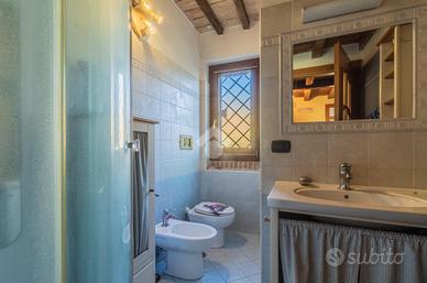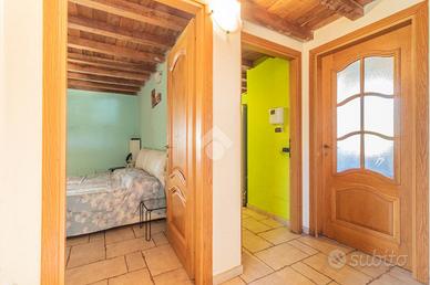 Scendendo al piano inferiore si apre la grande taverna, arricchita da un accogliente soggiorno con camino e da una cucina in muratura. Completano il piano due camere, un pratico ripostiglio e un bagno finestrato.